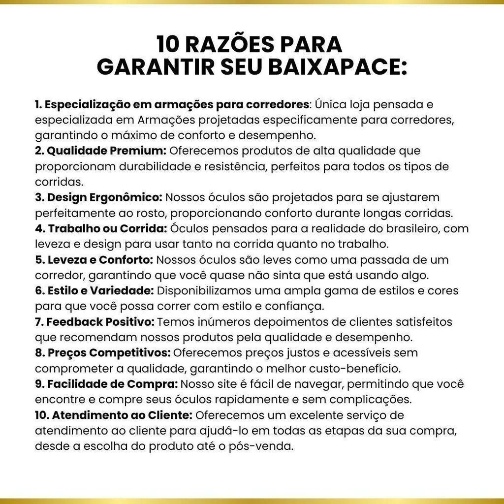 - Peça sua armação + lente e garanta nosso Desconto Progressivo + Cashback de 20% + Frete Grátis no seu pedido e receba no conforto da sua casa prontinho para sair usando nos seus treinos e no dia-a-dia :)