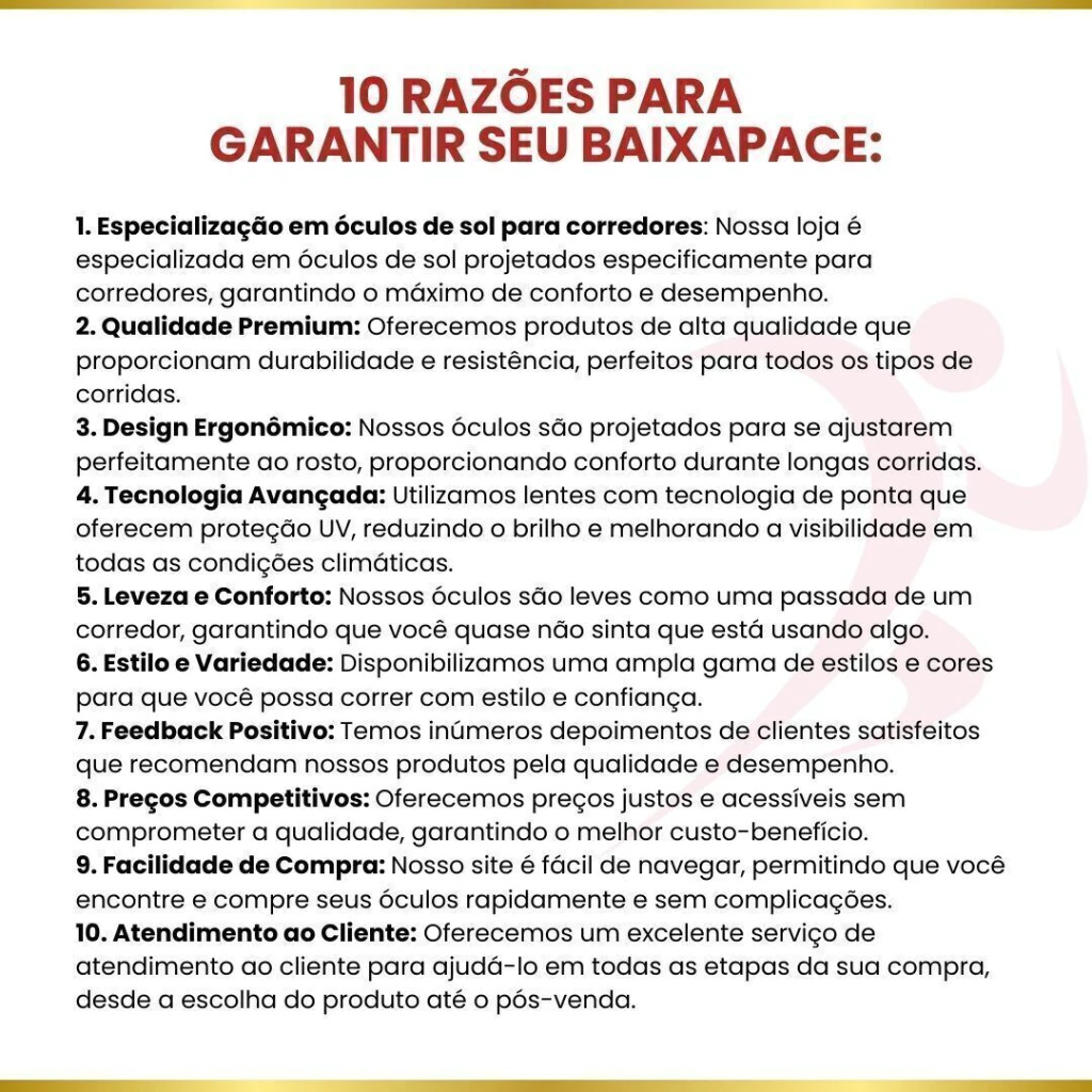 • Exclusividade: Disponíveis exclusivamente na Baixa Pace, o óculos que mais Baixa Pace no Brasil agora vai fazer parte do seu dia a dia na corrida, oferecendo um diferencial que só você terá.
